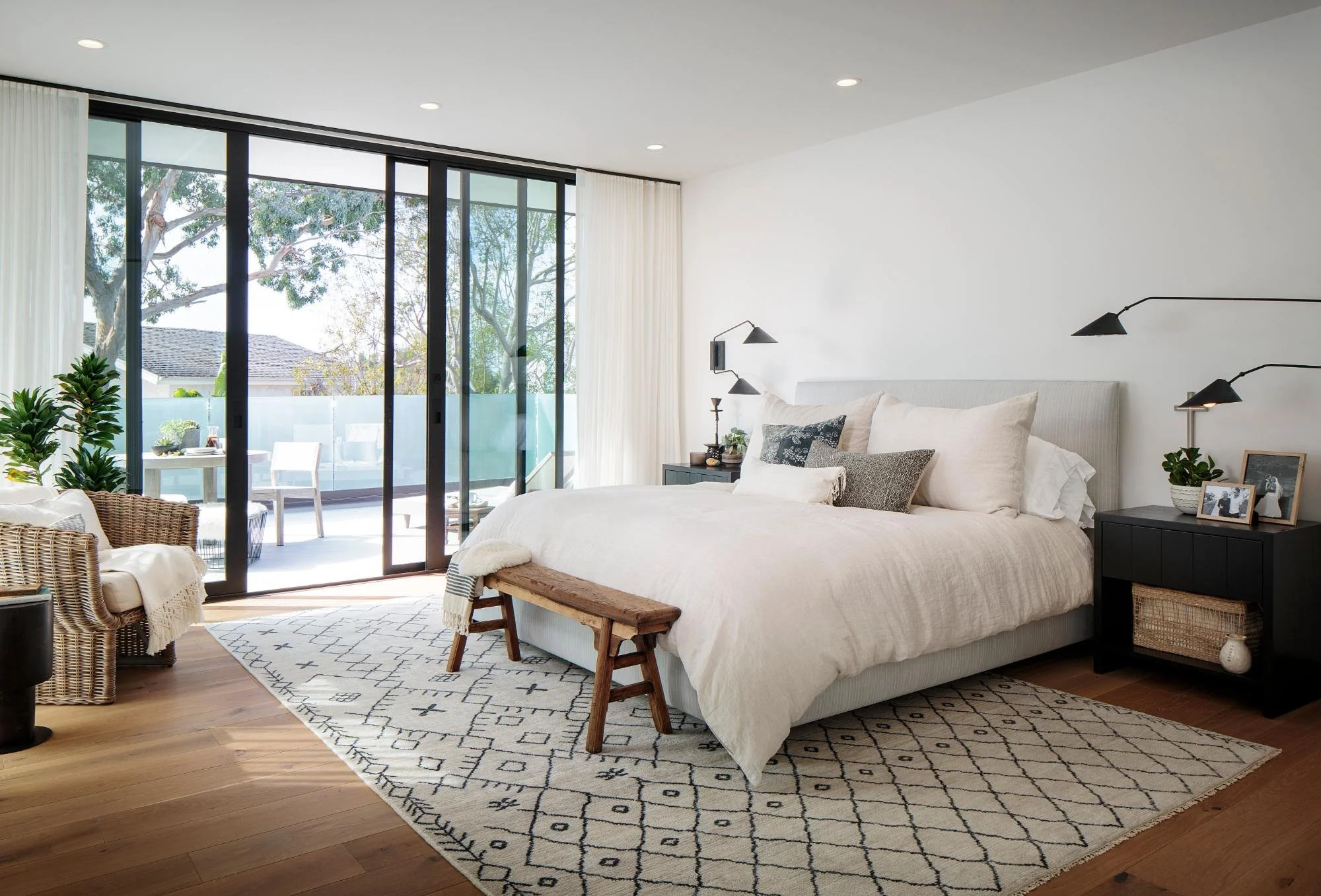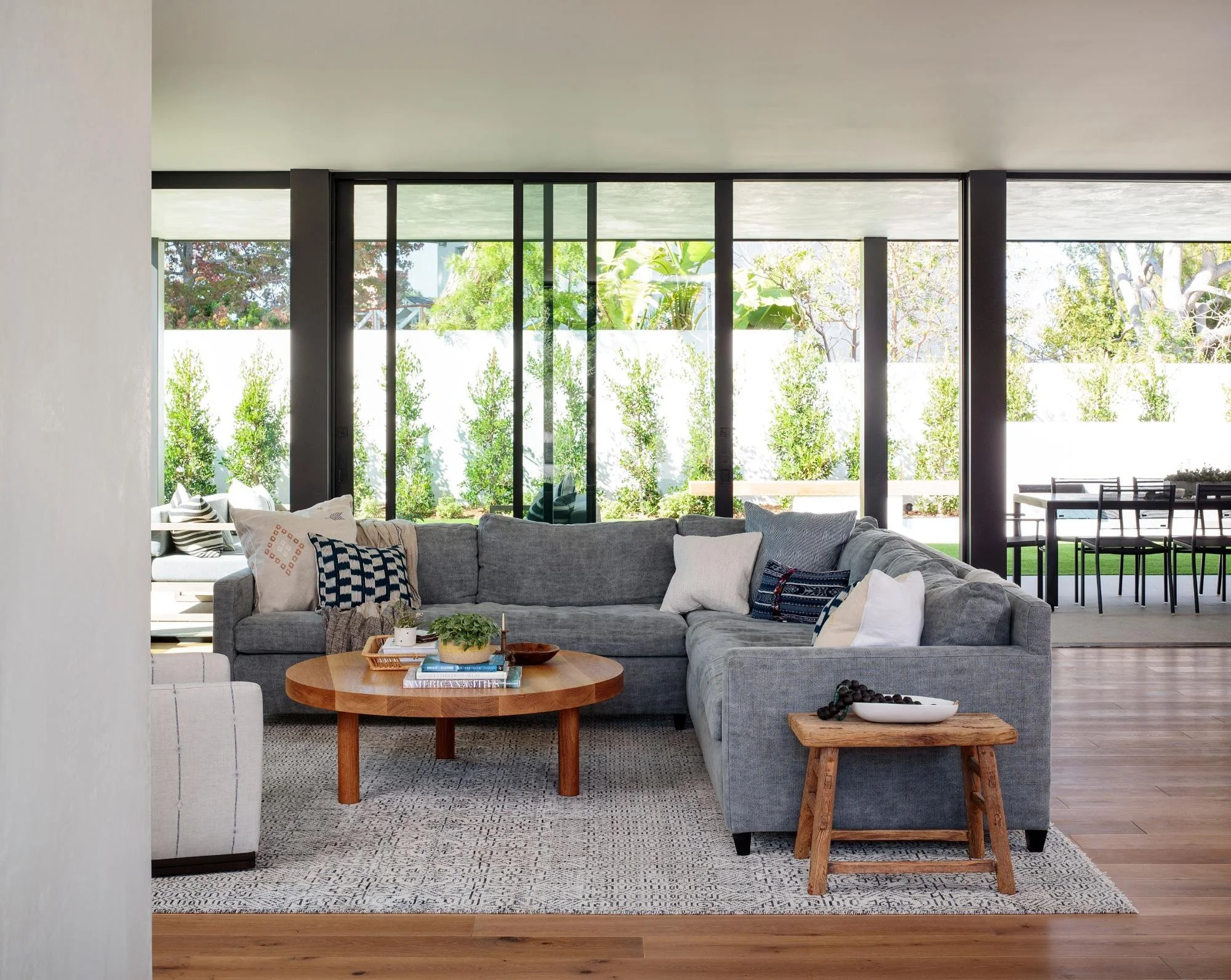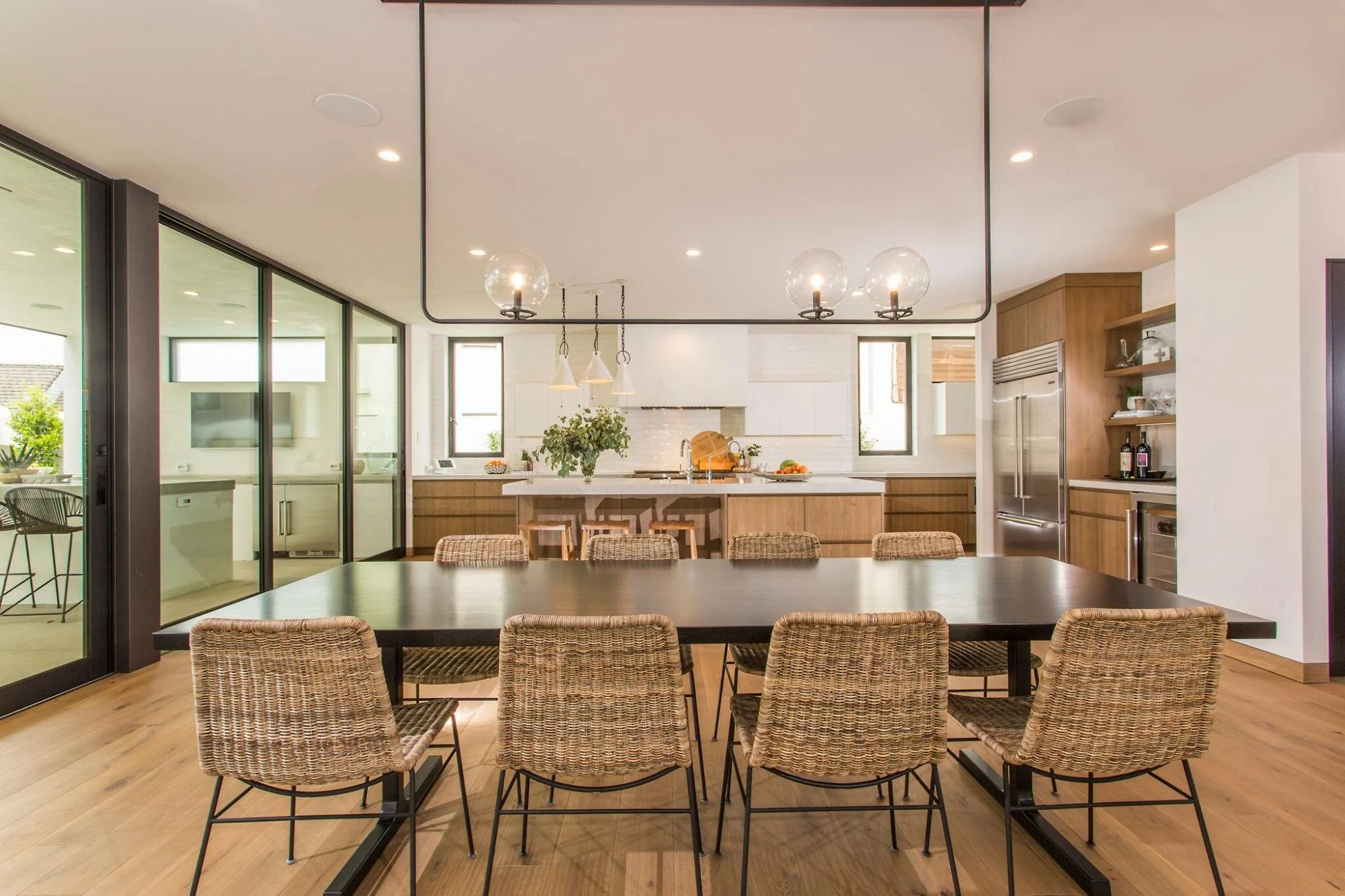 A first-time ground-up build designed as a warm, cohesive family home with true indoor-outdoor flow—made for entertaining, everyday durability, and that effortless “doors open” California lifestyle. A restrained palette of warm woods, concrete, black accents, and soft neutrals carries throughout the house for continuity, while woven textures and organic materials keep it from feeling stark. With a glass-heavy architecture that blurs inside and out, the design focuses on grounded, tactile finishes and timeless, livable choices that hold up to real life—without sacrificing calm, simplicity, or style.