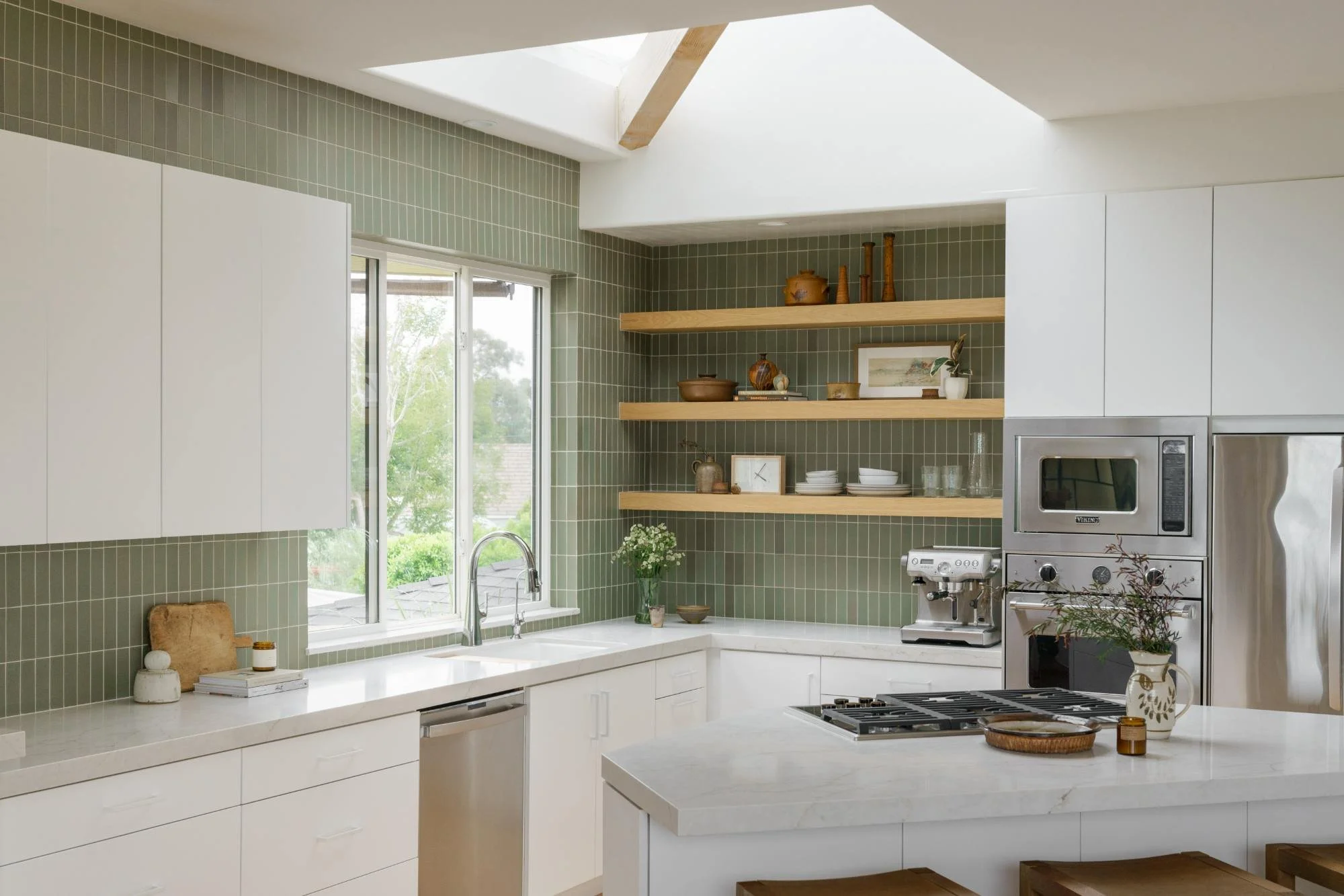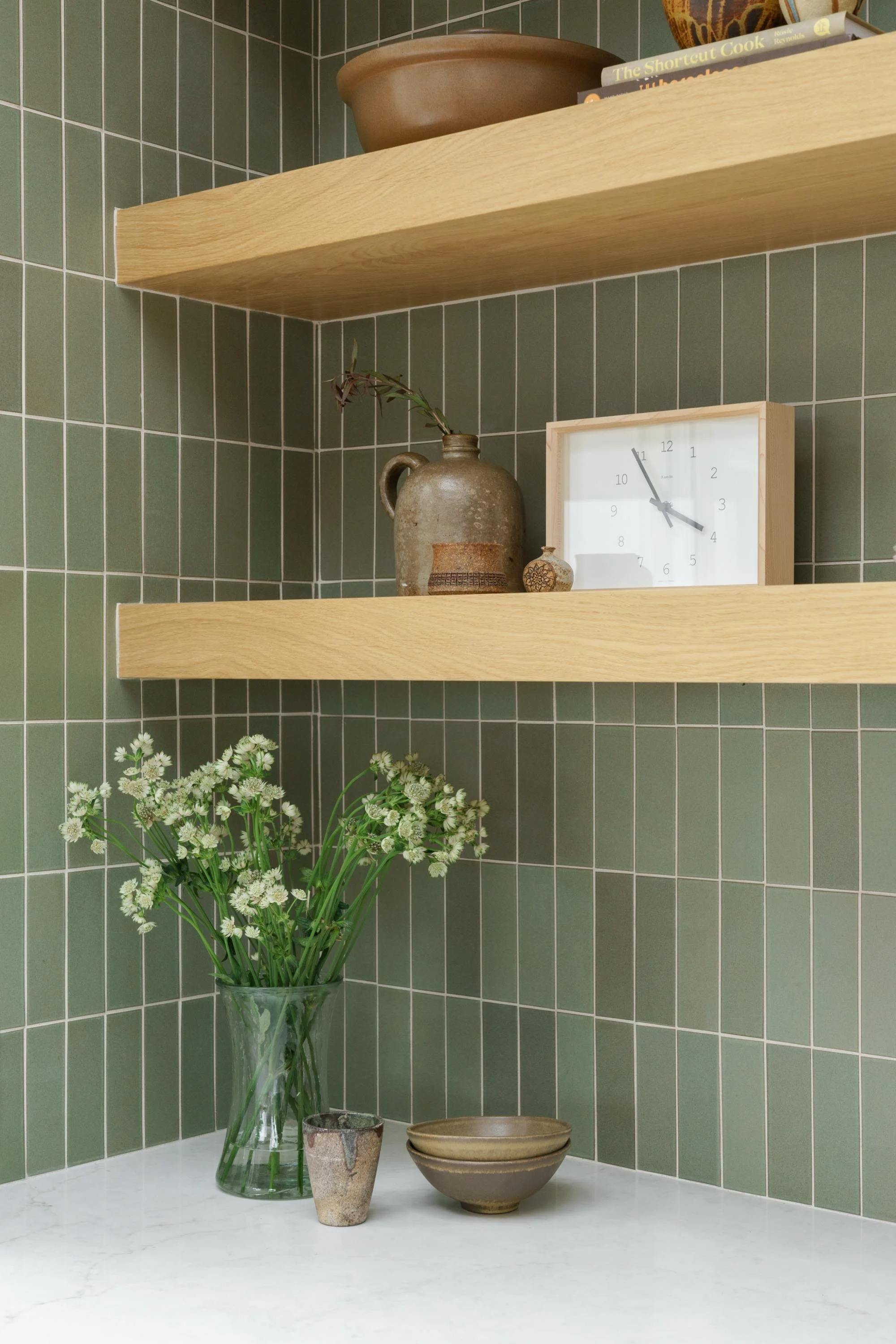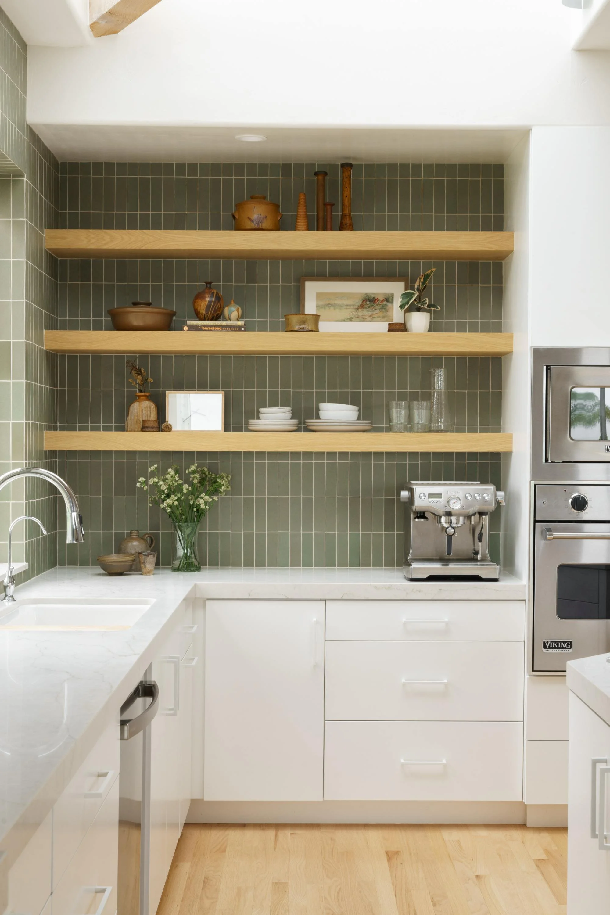 A kitchen renovation for neighbors who were open to trusting the process—resulting in a bright, welcoming space that balances clean function with meaningful personal layers. A custom tile color introduced depth and warmth, while the lower cabinetry and hardware were kept crisp and quiet so the eye stays pulled upward toward the tile and the ocean-facing view (no window treatments needed). The heart of the project is the story: treasured pottery collected by the homeowner’s mother—an interior designer—was thoughtfully integrated into open display, making the kitchen feel fresh, personal, and rooted in family history.